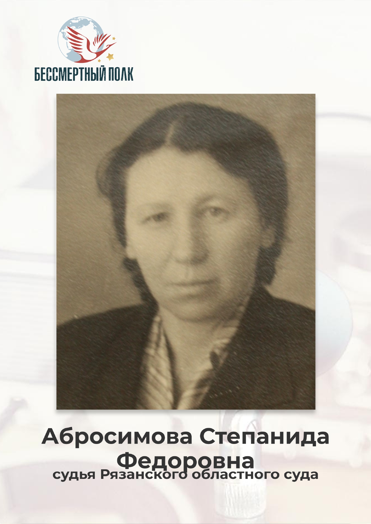 Степанида Федоровна Абросимова родилась 24 ноября 1903 года в деревне Озеро Дзержинского района Смоленской области. После окончания юридических курсов, с декабря 1938 года по 28 ноября 1941 года работала народным судьей в городе Рязани и Уфе. В 1942 – 1943 годах вернулась в Рязань и работала заведующей юридической консультацией.