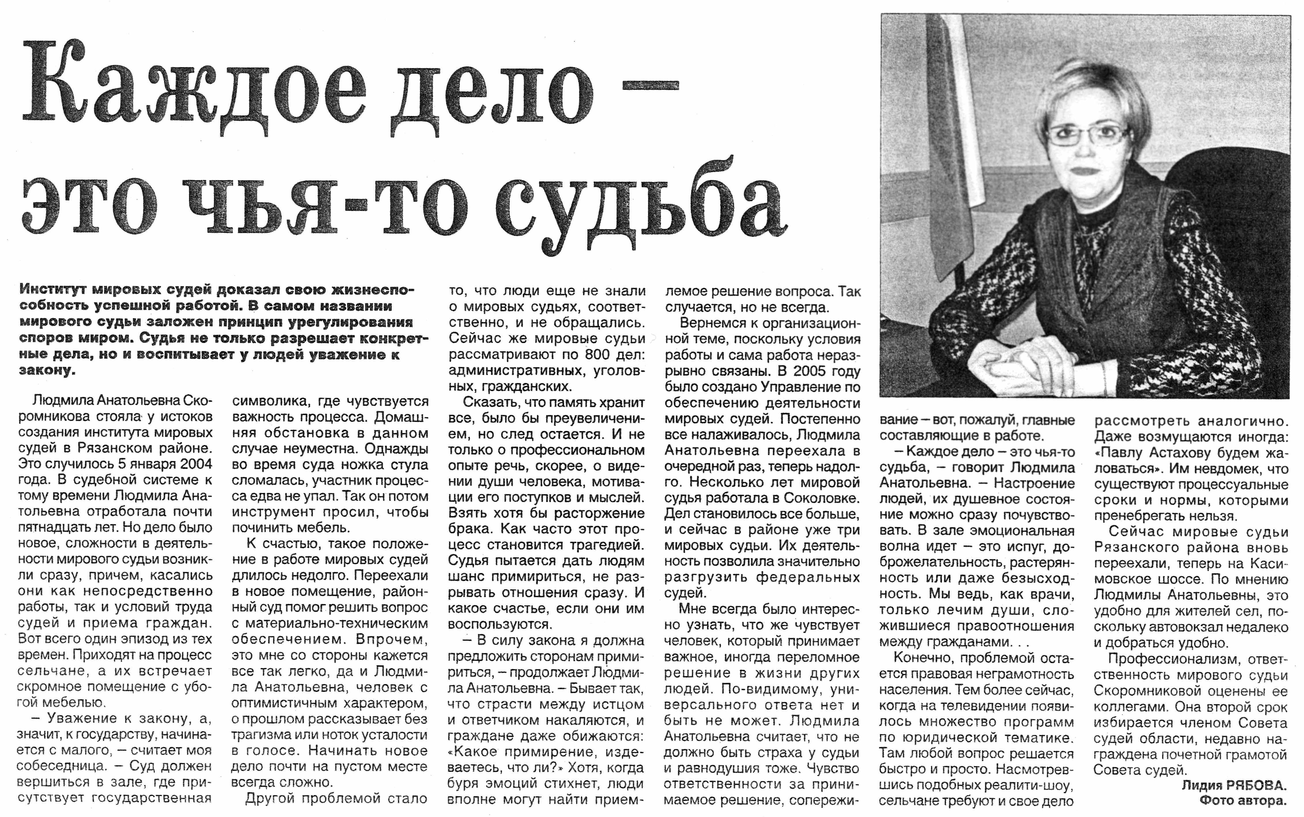 «Каждое дело – это чья-то судьба». Интервью с судьей Л.А. Скоромниковой. Лидия Рябова, областная газета «Рязанские ведомости» от 17.04.2009 г.