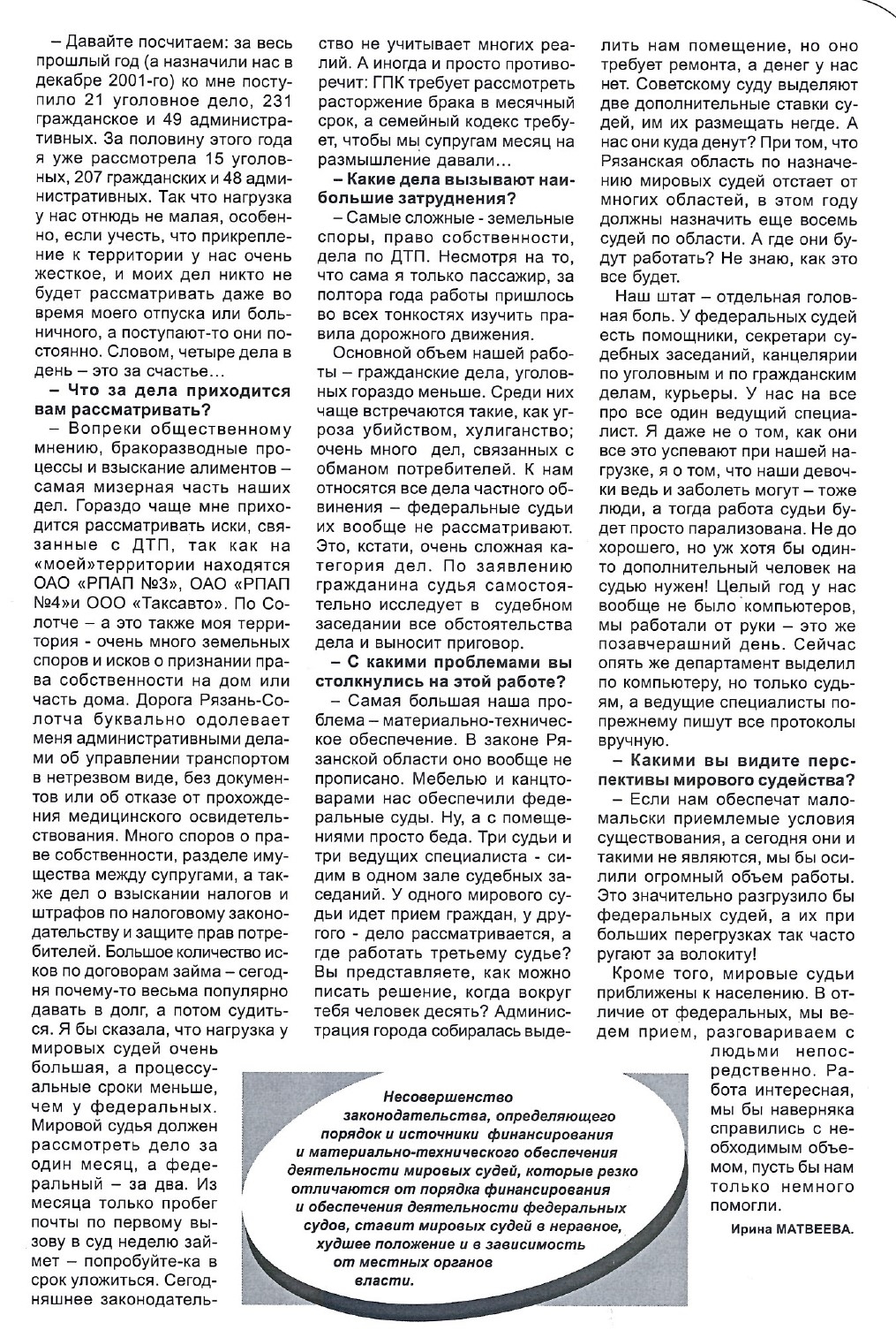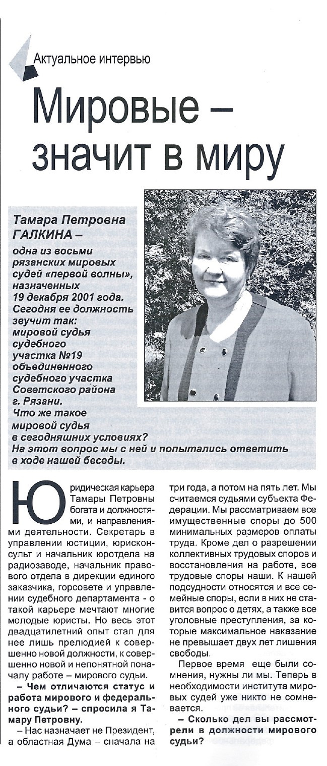 "Мировые - значит в миру", интервью с Т.П. Галкиной, Ирина Матвеева, "Буква закона" № 2 2003 г.