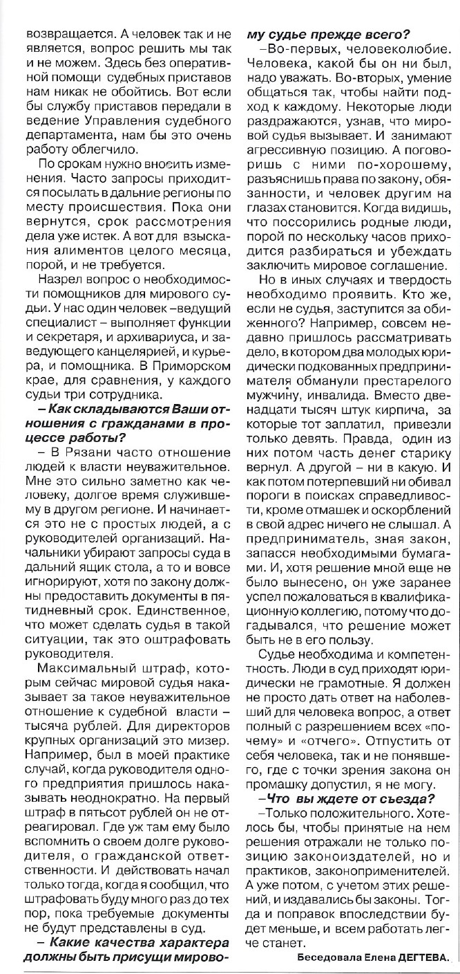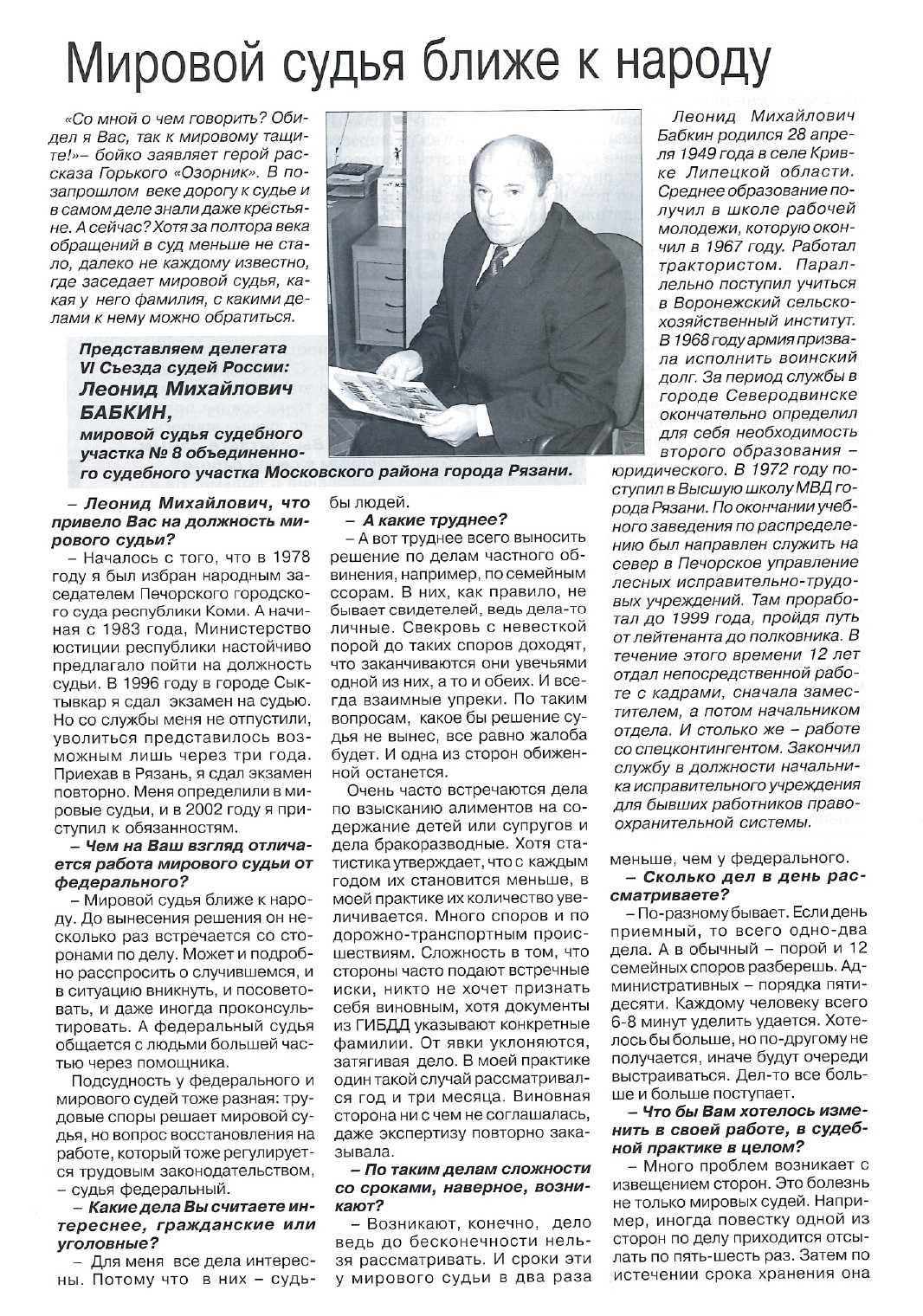 "Мировой судья ближе к народу", интервью с Л.М. Бабкиным, Елена Дегтева, "Буква закона" № 3-4 (7-8) 2004 г.